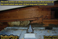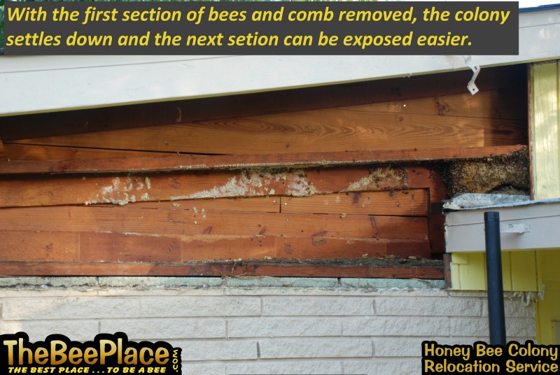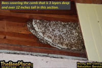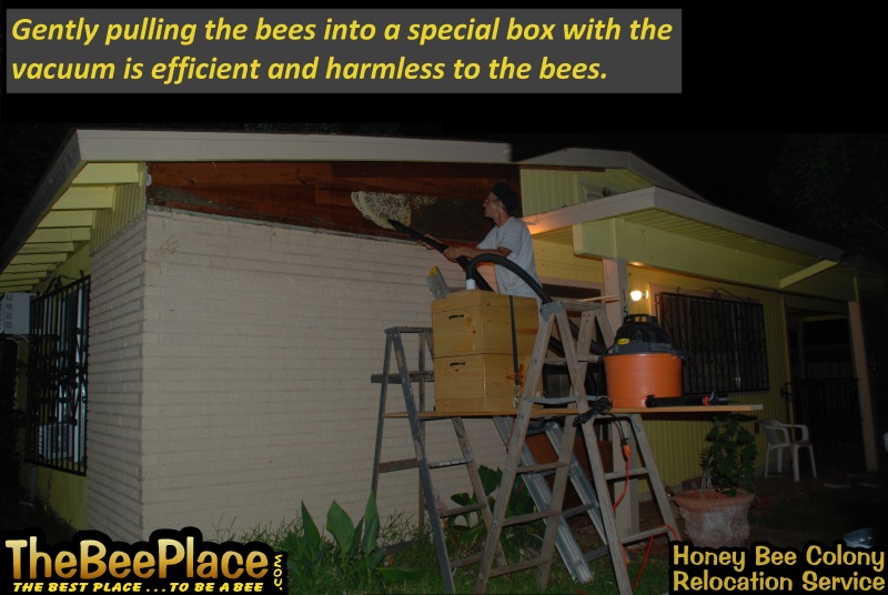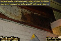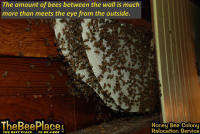 To relocate the bees alive, we carefully removed the comb in sections, including the brood and the honey and place the sections of comb in special frames that fit into a wooden box for transport. Many of the worker bees form clusters around the hive area, in holes and crevices on the inside of the wall. These are vacuumed into the lower section of the BeeVac and held there safely out of harms way. |
