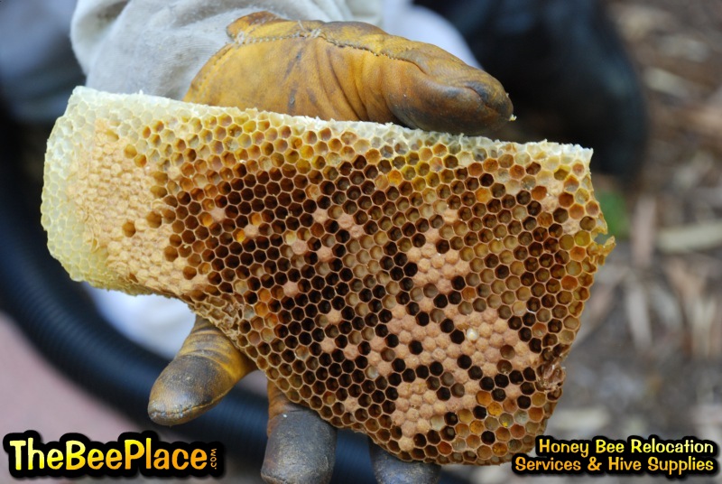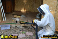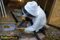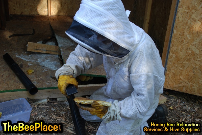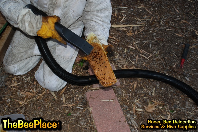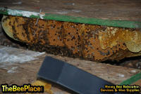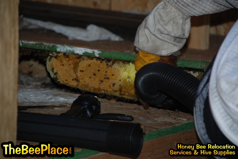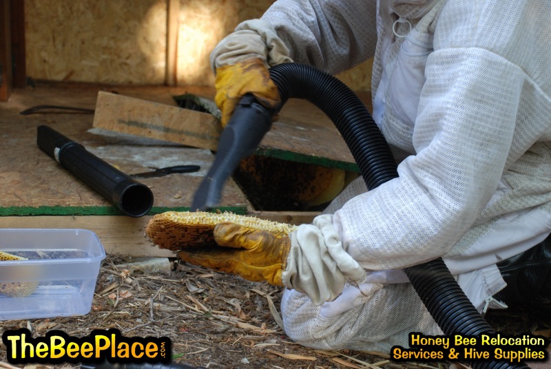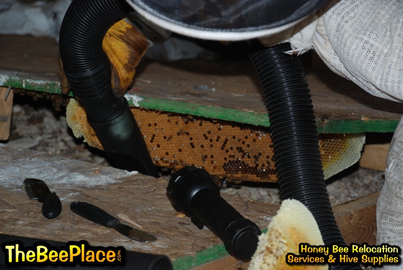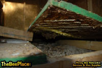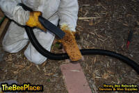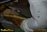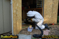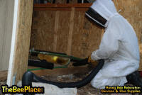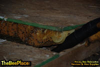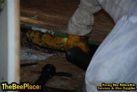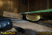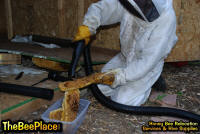 To relocate the bees alive, we carefully removed the comb in sections, including the brood and the honey and place the sections of comb in special frames that fit into a wooden box for transport. Many of the worker bees form clusters around the hive area, in holes and crevices on the inside of the wall. These are vacuumed into the lower section of the BeeVac and held there safely out of harms way. |