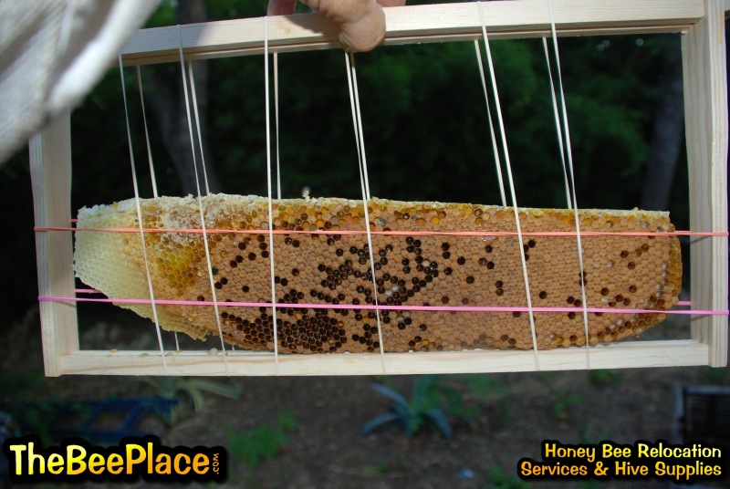Once the bulk of the bees are contained, the box is closed and the entire colony is relocated to our safe and eco friendly bee yard where they will join other hives and do what bees like to do, collect pollen and raise their young. |