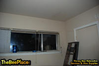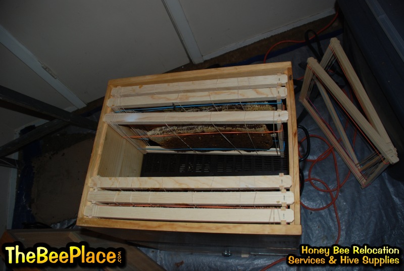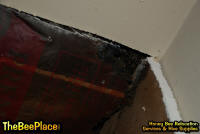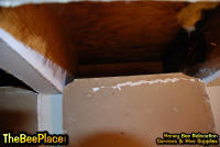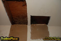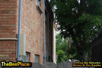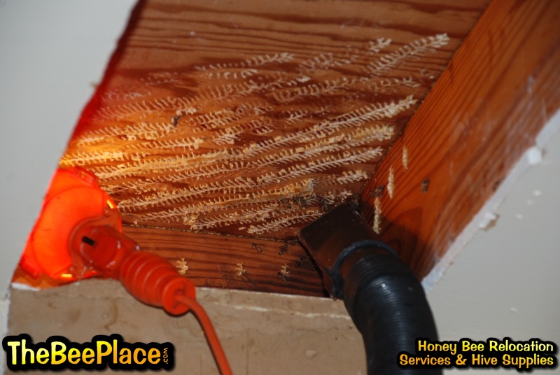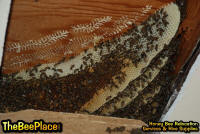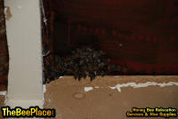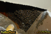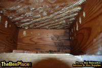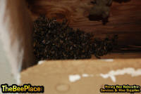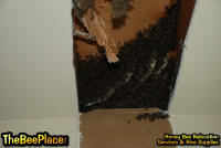 To relocate the bees alive, we carefully removed the comb in sections, including the brood and the honey and place the sections of comb in special frames that fit into a wooden box for transport. Many of the worker bees form clusters around the hive area, in holes and crevices on the inside of the space between the inside and outside wall and ceiling and roof. These are vacuumed into the lower section of the BeeVac and held there safely out of harms way. |
