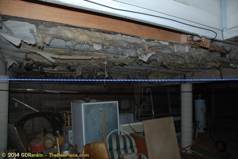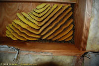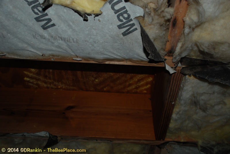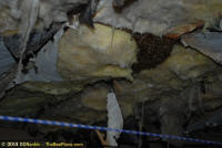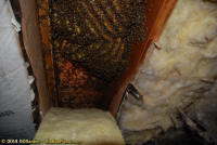 To relocate the bees alive, we carefully removed the comb in sections, including the brood and the honey and place the sections of comb in special frames that fit into a wooden box for transport. Many of the worker bees form clusters around the hive area, in holes and crevices on the inside of the wall. These are vacuumed into the lower section of the BeeVac and held there safely out of harms way. |