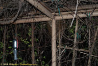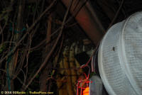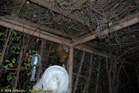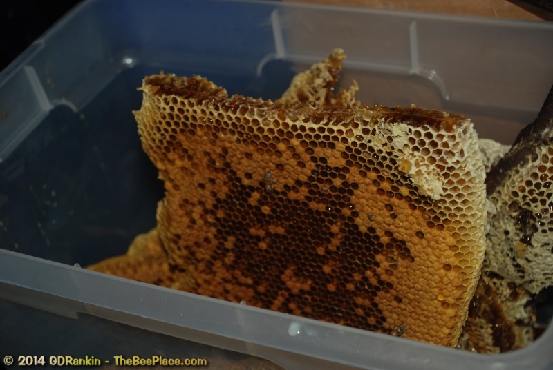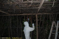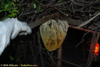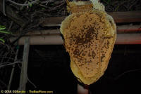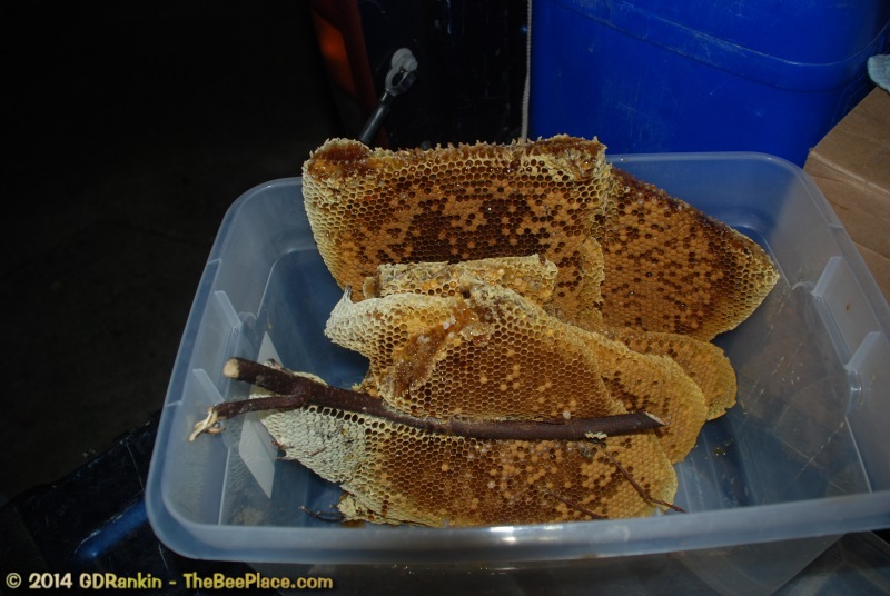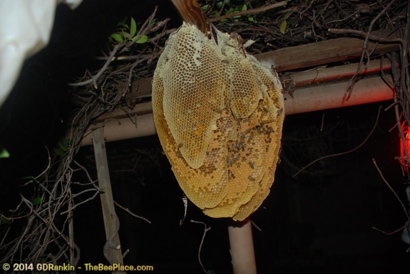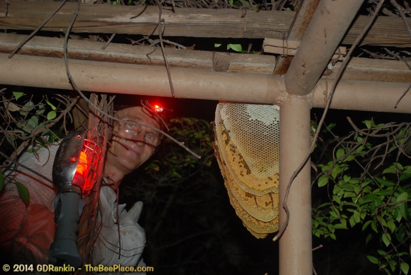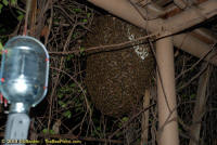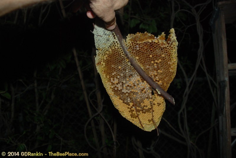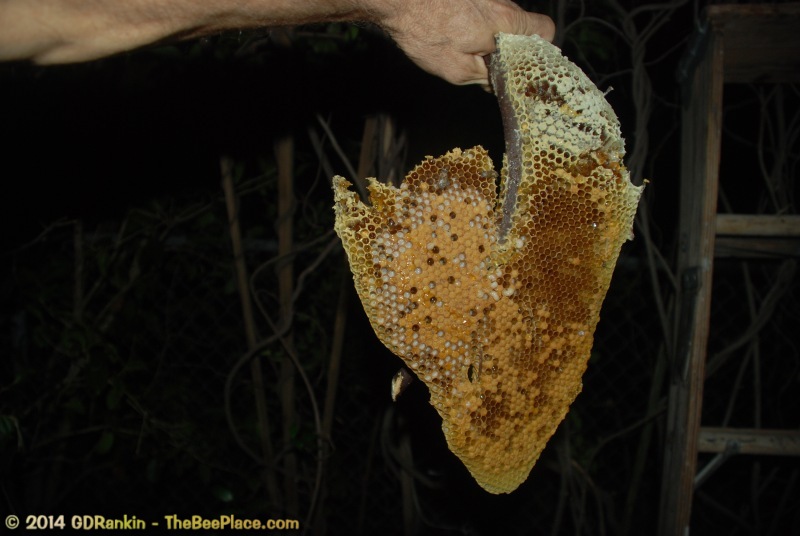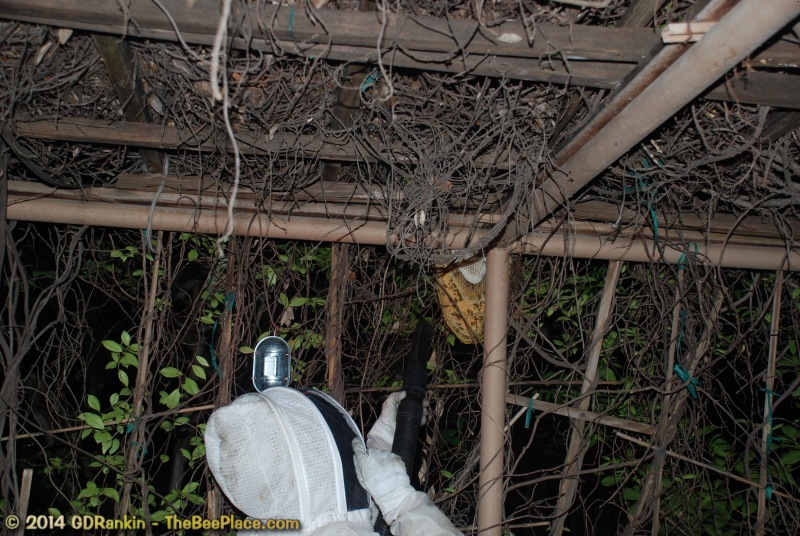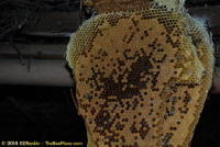 To relocate the bees alive, we carefully removed the comb in sections, including the brood and the honey and place the sections of comb in special frames that fit into a wooden box for transport. Many of the worker bees form clusters around the hive area, in holes and crevices and other hiding places. These are vacuumed into the lower section of the BeeVac and held there safely out of harms way. |