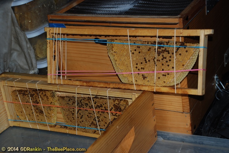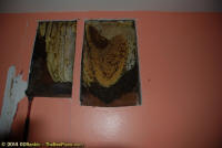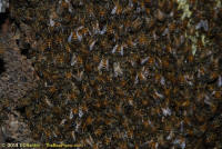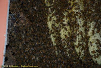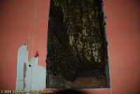 To relocate the bees alive, we carefully removed the comb in sections, including the brood and the honey and place the sections of comb in special frames that fit into a wooden box for transport. Many of the worker bees form clusters around the hive area, in holes and crevices on the inside of the wall. These are vacuumed into the lower section of the BeeVac and held there safely out of harms way. |