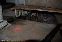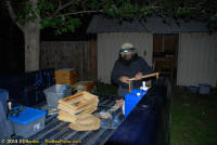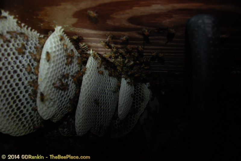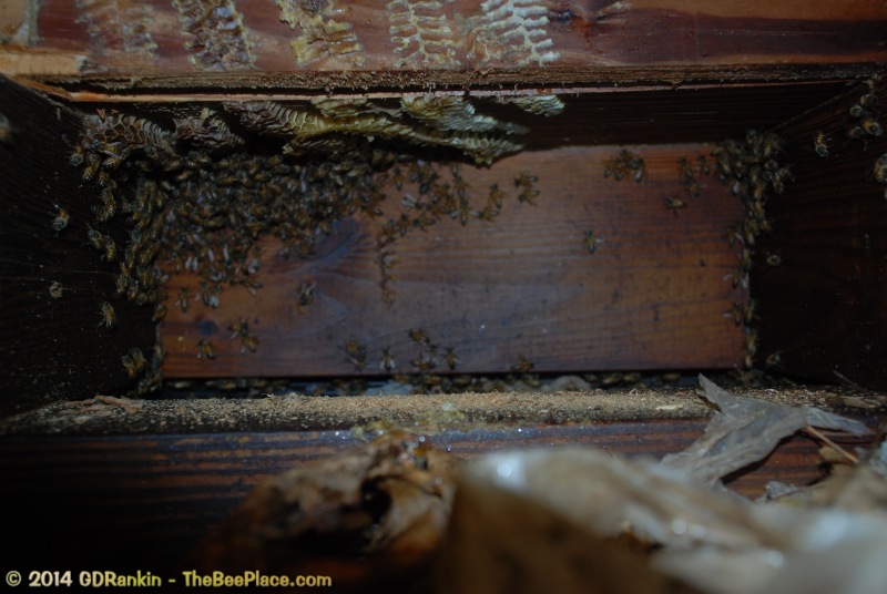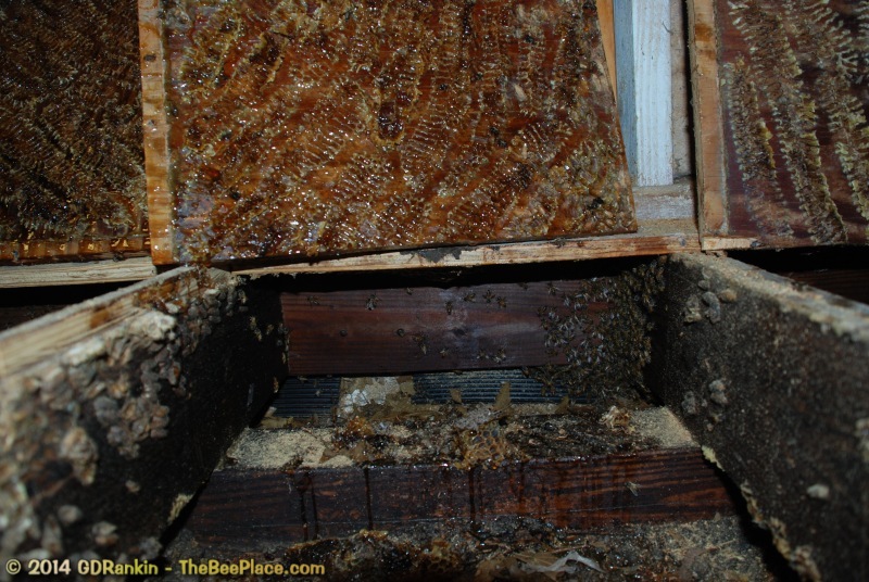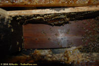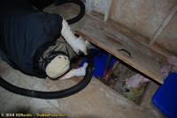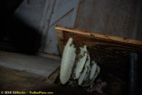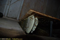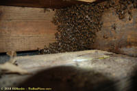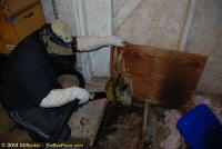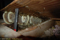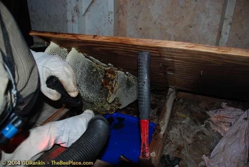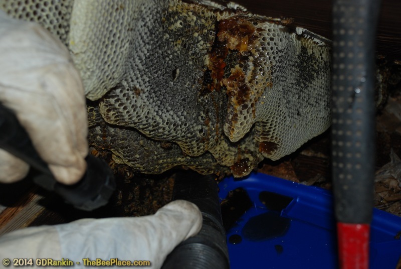 To relocate the bees alive, we carefully removed the comb in sections, including the brood and the honey and place the sections of comb in special frames that fit into a wooden box for transport. Many of the worker bees form clusters around the hive area, in holes and crevices on the inside of the wall. These are vacuumed into the lower section of the BeeVac and held there safely out of harms way. |