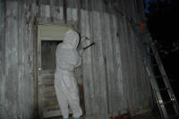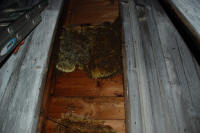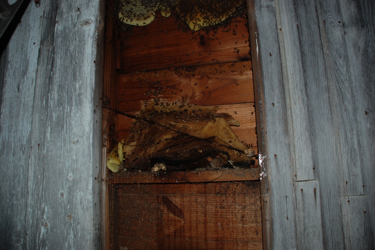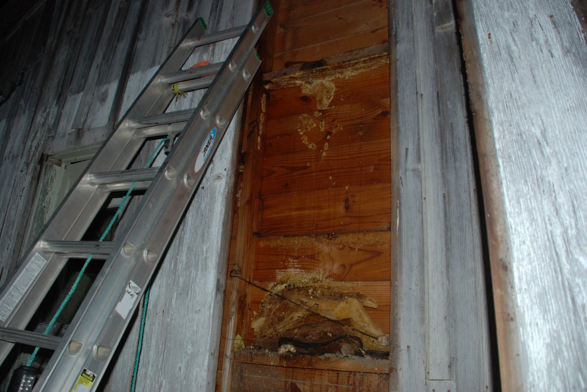 After carefully removing the old lumbar to expose the colony, we carefully removed the comb in sections, including the brood and the honey and place the sections of comb in special frames that fit into a Langstroth style bee hive. Many of the worker bees form clusters around the hive area, in holes and crevices on the inside of the wall. These are vacuumed into the lower section of the BeeVac and held there safely out of harms way.